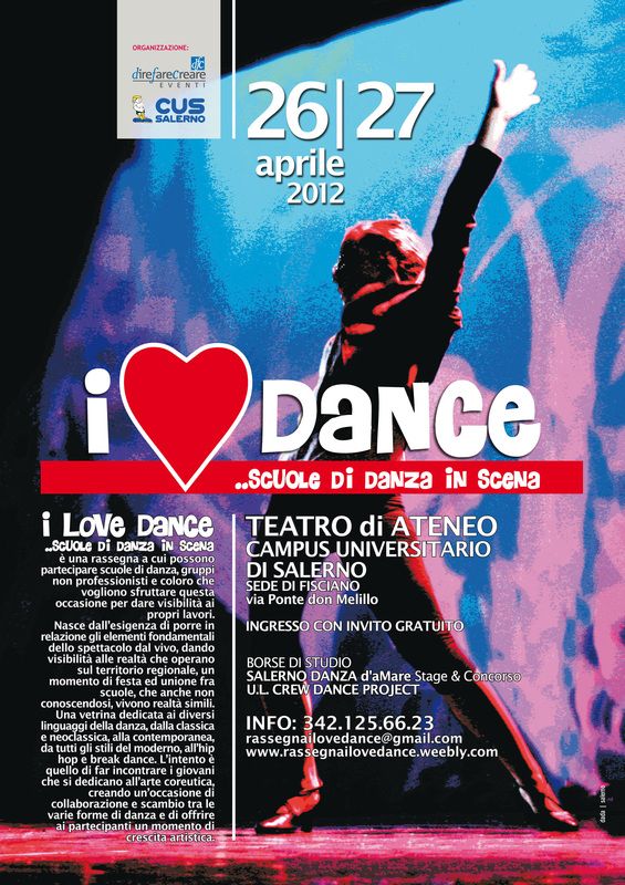 L'intento è quello di far incontrare i giovani che si dedicano all'arte coreutica, creando un'occasione di collaborazione e scambio tra le varie forme di danza e di offrire ai partecipanti un momento di crescita artistica. Borse di Studio per prestigiosi campus estivi, saranno assegnate durante la serata da una commissione composta da maestri di chiara fama. I love dance ..scuole di danza in scena, si terrà il 26 e 27 aprile 2012 al Teatro di Ateneo presso il Campus Universitario di Salerno, sede di Fisciano, le iscrizioni si chiuderanno il 19 aprile 2012.