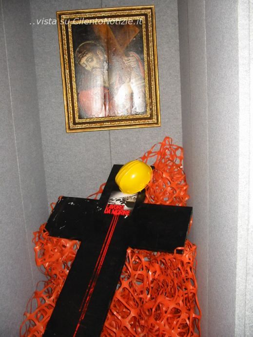 Il “Cristo portacroce” della Scuola parmense, dal solcato, livido volto che evidenzia il dolore fisico in contrasto con la sua mano affusolata in primo piano, che sembra non reggere la croce, ma suonare l’estasi spirituale, è stato posizionato da sfondo in un idoneo incavo, trovando uno sviluppo continuativo in una grande croce posta su rete quale materiale edile, sovrastata da un giallo elmo di operaio, con evidente scritta, “LAVORO DA MORIRE”, di denuncia dei troppi morti per il lavoro non tutelato di tanti operai. Quella sofferenza ed abbraccio della croce del Cristo dipinto diviene sofferenza ed ingiusta accettazione del rischio di ogni uomo in alcune condizioni lavorative.