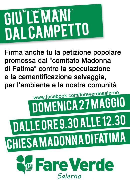 Domenica 27 maggio dalle ore 9:30 alle ore 12:30 l'associazione ambientalista Fare Verde Salerno sarà presente negli spazi antistanti la chiesa Madonna di Fatima a Pastena per dar seguito alla petizione popolare promossa dal Comitato 'Madonna di Fatima' per scongiurare la cementificazione selvaggia prevista dal progetto presentato dai vertici della chiesa e approvato in consiglio comunale all'oscuro dei residenti del quartiere.