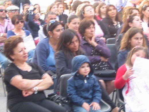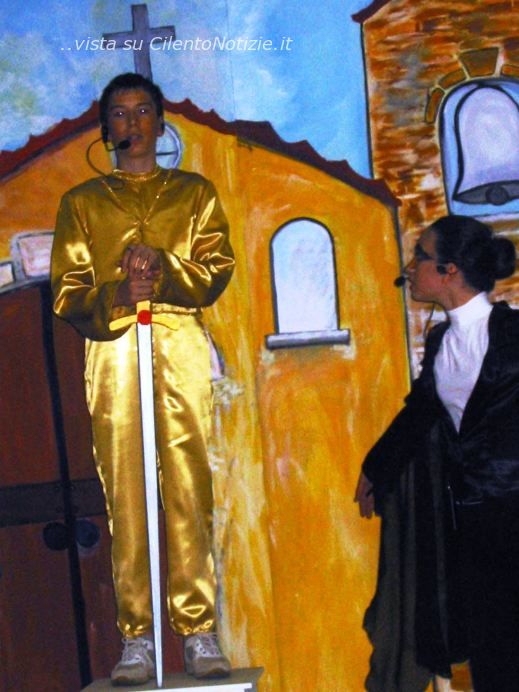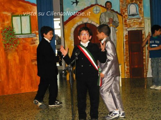 Assente il Sindaco Costabile Spinelli, per gioiosi motivi familiari, il piccolo “Sindaco” Iacopo Guida, con alcuni suoi consiglieri, con fascia tricolore e forte grinta, ha accolto il “”Principe Felice”. La favola di Oscar Wilde, che dà il nome ad una raccolta dedicata ai suoi figli, è stata la impegnata ed interessante scelta dell’insegnante Stefania Sarluca che, per il Progetto ”Arte Attiva”, l’ha fatta interpretare ad allievi dell’Istituto Leoncavallo, selezionati tra elementari, materne e medie. La favola scritta nel 1888 dal grande scrittore nordico è di grande attualità, per la crisi economica in atto e per i valori che ripropone in esaltazione del vero amore, verso ogni espressione di vita, e della generosità molto rara, inoltre particolarmente educativa ed appropriata in questo habitat naturale. La statua del Principe (Marco Sarno bravissimo sia nella sua immobilità che nell’esprimere le tristi considerazioni!) felice finchè, posizionata in un giardino, poteva vedere solo bellezze naturali esaltate dai colori e dai profumi, diviene triste quando sarà traslocata in una piazza, dove potrà constatare le miserie e le problematiche degli abitanti. Forse una statua, ci dice Wilde, riesce a volte a vedere, constatare e trovare soluzioni più degli umani a questo preposti! Una rondinella, interpretata, in svolazzanti ali nere, da Albachiara La Pastina, in cerca d’amore, lo troverà in lui, al di là di ogni differenza tra animali ed umani, capace anche di vedere la sua anima imprigionata in una statua, affascinata dalla sua generosa sensibilità. Il Principe infatti si farà spogliare di tutte le sue gemme e delle sue lamine d’oro per aiutare i poveri, non mancando di valutare la necessità di aiuto economico agli operatori nell’Arte Teatrale. Non mancano richiami al rispetto dei volatili, troppo spesso presi di mira. “Sogno”di Shumann ha più volte accompagnato la rappresentazione, tra voli di rondini_bambine che si sono espresse con recitazioni e balletti ( Mary Malzone, Fabiola Lo Schiavo, Eleonora Giannella, Federica Capezzuto, Grazia Ambrosano). Alla fine l’amministrazione Comunale, (il Sindaco citato ed i consiglieri Carmine Schiavo, Nicolas Pagano, Silvio Pagano, Marco Schiavo), tra litigi per il predominio personale di ciascuno, deciderà di abbattere la statua , che ha perso i suoi abbellimenti……….ma questa saprà salvare le cose principali,……… le ali della rondine ed il suo cuore!