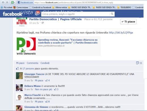 “Vergogna”, ”traditori”, ”venduti”, “non vi voteremo più” ecct. Sono alcune delle frasi più usate sulla bacheca nazionale del PD in queste ore da cittadini e personale della Scuola Pubblica Statale. Quasi 300 messaggi, tutti molto critici con il PD dopo la diffusione della notizia, poi smentita(?) dei 200 milioni di euro alle Scuole private nell’ultima manovra finanziaria(denominata spending review). I docenti, soprattutto quelli precari, sono infuriati sempre con il PD anche per le dichiarazioni di una sua parlamentare, la De Torre, che in un video dichiara che le Graduatorie ad Esaurimento verranno abolite ed i docenti precari entreranno in un albo gestito direttamente dalle Scuole….In pratica, docenti di 40-50 anni dopo 10-20 anni di precariato, dopo essere stati sfruttati , invece di entrare finalmente a tempo indeterminato nella Scuola…..dovranno aspettare la chiamata del Dirigente Scolastico!!!!!