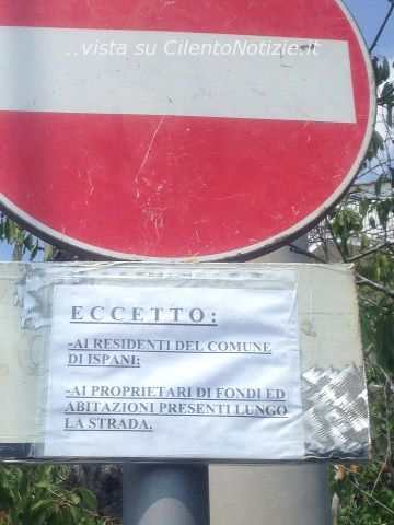 Coperto il segnale stradale che vietava l’accesso ai cittadini di Santa Marina nel tratto di strada Poncelli-Soranna , il breve percorso che ricade nel Comune di Ispani. Un’ordinanza del Sindaco, emessa il 23 luglio, vietava il transito nel tratto in questione, ai soli cittadini di Santa Marina, consentendo invece il passaggio ai residenti del comune di Ispani.