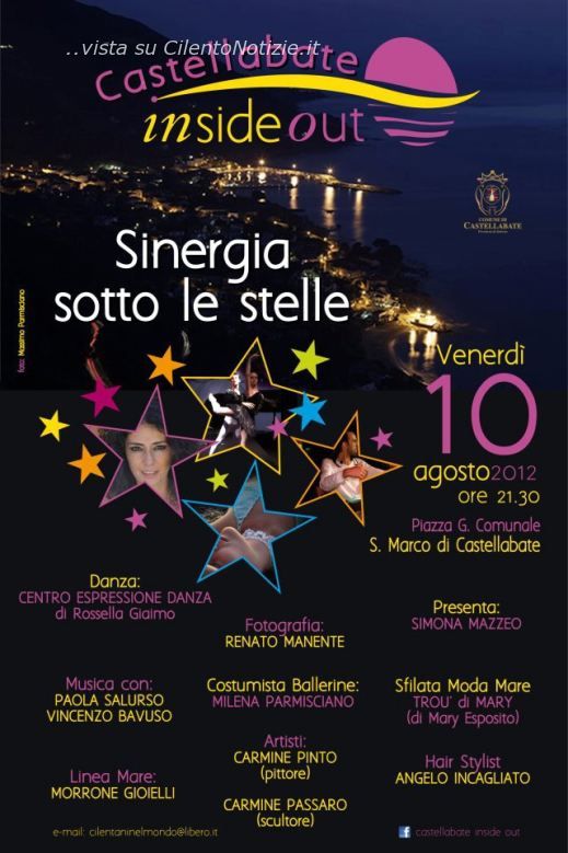 La serata, organizzata dall’Associazione culturale Castellabate Inside Out, costituita da Mary Esposito, Luigi Migliorino e Massimo Parmisciano, vuole rendere omaggio all’estro e alla genialità di artisti nostrani, mostrando quanto la sinergia tra talenti possa portare ad idee di successo.