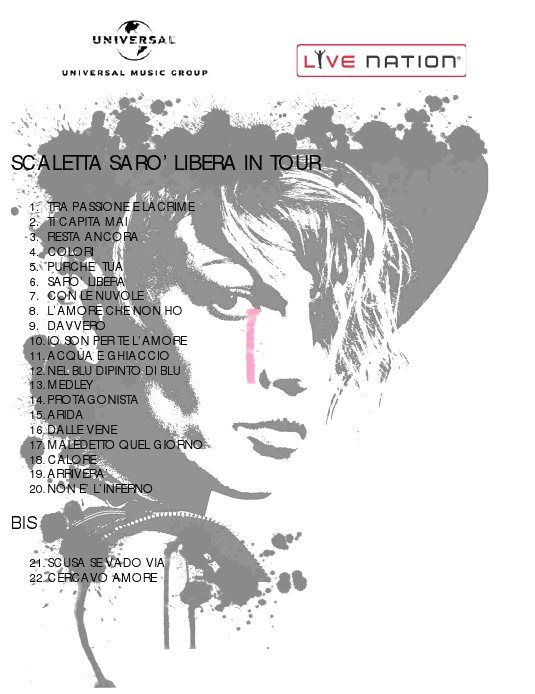 Sul palco la graffiante voce sarà accompagnata dalla sua affiatata band formata da Daniele Formica alla batteria, Simone De Filippis e Flavio Pasquetto alle chitarre, Pietro Casadei al basso, Luca Cirillo alle tastiere e Arianna Mereu, sua ex ‘compagna di classe’ ad Amici 9, ai cori. Densa la scaletta, composta da 22 brani, che prenderà il via con “Tra passione e lacrime”, proseguirà con “Ti capita mai”, “Resta ancora”, “Colori”, “Purché tua” e si scioglierà, di certo, in un unico canto col pubblico con “Sarò libera” e “Con le nuvole”. Nel mezzo l’omaggio a Domenico Modugno con “Nel blu dipinto di blu”, cui seguirà un inatteso medley per accompagnare i fan verso la seconda parte dello show chiuso da una ‘tripletta’ da urlo con “Calore”, “Arriverà”, “Non è l’Inferno”, riarrangiati per l’occasione. Quindi doppio bis con “Scusa se vado via”, perfettamente posizionato per accomiatarsi dal pubblico, e con “Cercavo amore”, tra i brani più ascoltati e trasmessi di questa estate.