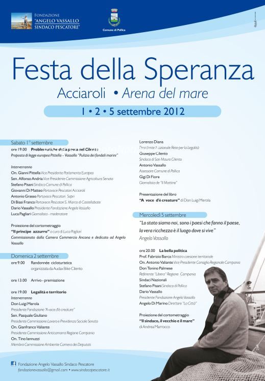 Siamo lieti di invitarla alla 'Festa della speranza', che si terrĂ ad Acciaroli, presso l'Arena del mare, dal primo al 5 settembre.