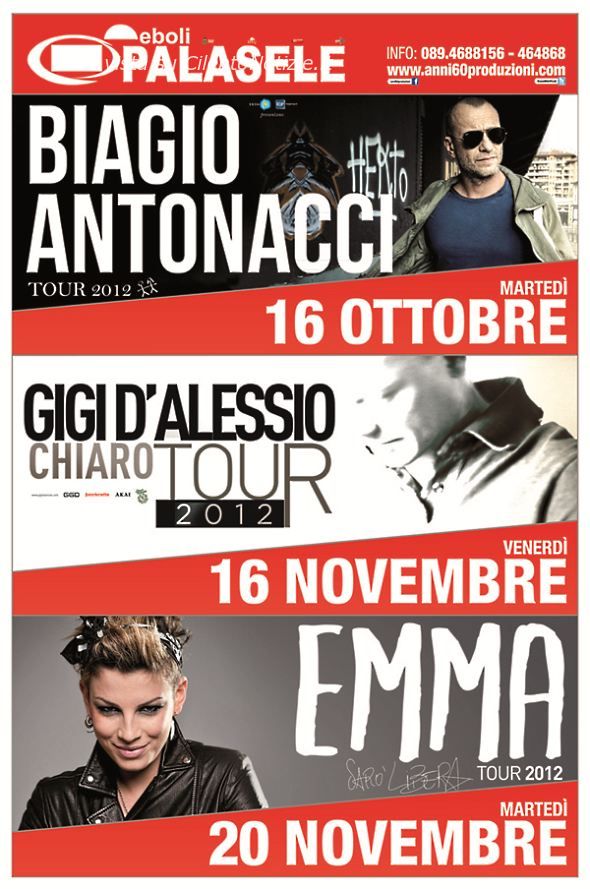 Salerno, 15 settembre 2012 Manca un mese esatto alla grande ripartenza in musica del PalaSele di Eboli. L'autunno musicale si preannuncia quanto mai 'caldo' con il ritorno dei big che hanno già infiammato tra primavera ed estate le platee campane. Toccherà a Biagio Antonacci inaugurare la nuova stagione spettacolare del palazzetto salernitano dove è atteso martedì 16 ottobre. Venerdì 16 novembre toccherà invece a Gigi D'Alessio, mentre è fissato per il 20 novembre il grande ritorno della regina dell'estate live, Emma Marrone.