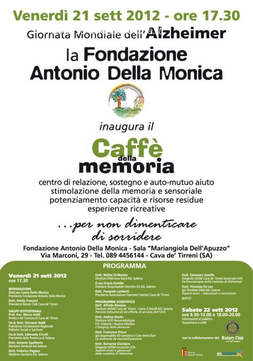 “…Per non dimenticare di sorridere”: in concomitanza con la Giornata Mondiale dell’Alzheimer, la Fondazione Antonio Della Monica di Cava de’ Tirreni (Sa) inaugura il “Caffè della memoria”, centro di relazione, sostegno ed auto-mutuo aiuto, stimolazione della memoria e sensoriale, esperienze ricreative, potenziamento di capacità e risorse residue, destinato ad accogliere i malati di Alzheimer ed i loro familiari ed accudenti.