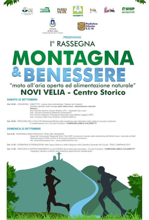 NOVI VELIA – “Movimento fisico all’aria aperta e dieta mediterranea” saranno il leitmotiv della Iᵃ edizione di Montagna & Benessere, manifestazione promossa dall’associazione sportiva Podistica Cilento S.S.18 in partnership con il comune di Novi Velia, in programma sabato 22 e domenica 23 settembre 2012. L’intento è la fruizione dell’ambiente naturale in maniera sostenibile, attraverso la disciplina atletica della corsa, che racchiude in sé i benefici del miglioramento dello stato fisico e la soddisfazione dei bisogni spirituali, attraverso la riscoperta del contatto tra uomo e natura. Un evento poliedrico, con momenti di riflessione sugli aspetti salutistici di una corretta alimentazione che si accompagneranno alla gara podistica che si snoderà lungo i sentieri del Monte Gelbison.