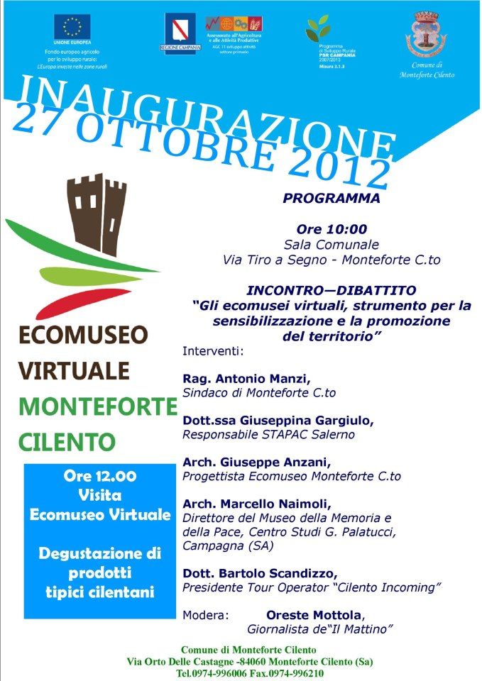 Sabato 27 Ottobre alle ore 10 verrà inaugurato l’ “Ecomuseo Virtuale di Monteforte Cilento”, allestito presso i locali comunali in via Tiro a Segno, nel pieno centro cittadino.
