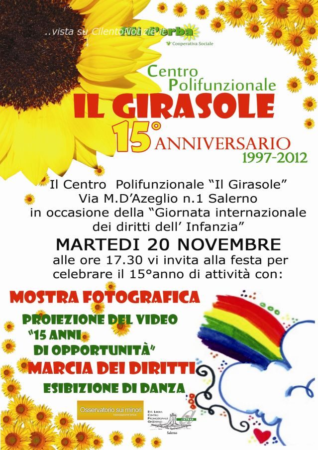 MARTEDI’ 20 NOVEMBRE dalle ore 17.30 in poi si terrà una manifestazione per festeggiare i 15 anni di attività ininterrotta del Centro Polifunzionale “IL GIRASOLE”, sito nel quartiere Sant’Eustachio di Salerno, in occasione della “GIORNATA INTERNAZIONALE DEI DIRITTI DELL’INFANZIA”. Dall’anno 1997 centinaia di bambini, ragazzi, famiglie e cittadini, hanno avuto un punto di riferimento socio-educativo-culturale-ricreativo e di sostegno sociale, con operatori e volontari che con passione e professionalità hanno svolto importanti azioni volte alla prevenzione dei disagi pre ed adolescenziali, di aiuto nelle situazioni di difficoltà, per valorizzare i valori di ognuno e realizzare prospettive di un futuro migliore.