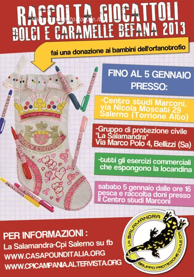 La Salamandra Salerno, gruppo di protezione civile dell’associazione culturale e di promozione sociale CasaPound Italia organizza a partire dalla prossima settimana una raccolta di giocattoli destinata ai bambini degli orfanotrofi e case famiglie situate nella provincia.