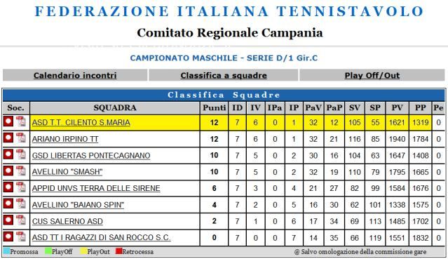 Si è disputata sabato l'ultima giornata di andata dei campionati regionali campani di tennistavolo. In serie D1 la squadra cilentana ha affrontato e battuto i cugini del Cus Salerno con un netto 5-0. Partita senza storia: nei cinque match disputati gli avversari sono riusciti a conquistare soltanto due set. Ricordiamo la regola campionato: ogni squadra schiera tre atleti titolari e ciascuno deve incontrare i tre della squadra avversaria. In totale si possono disputare nove singoli ma appena una squadra raggiunge cinque punti-vittorie la partita finisce ed i rimanenti singoli non si disputano. Con la vittoria di sabato il TT Cilento S.Maria di Squitieri, Iaccarino e Santis chiude il girone d'andata al primo posto se pur in coabitazione con la squadra di Ariano Irpino. Dal 9 febbraio inizierà il girone di ritorno. Il TT Cilento S.Maria sarà impegnato nella trasferta di Sorrento.