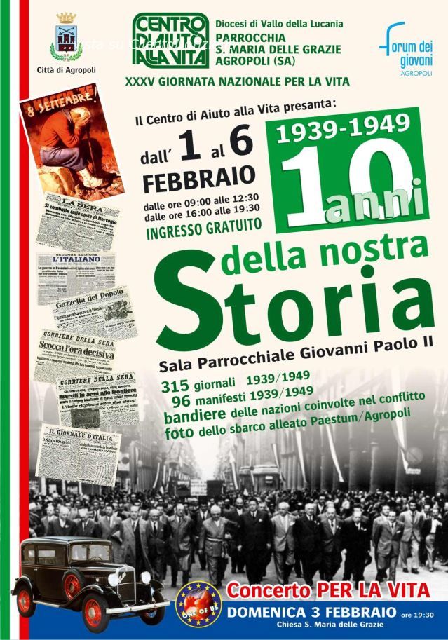 “10 anni della nostra storia 1939 - 1949” è la mostra promossa dal Centro di Aiuto alla Vita di Agropoli, in programma dall’1 al 6 febbraio, presso la sala polifunzionale “Giovanni Paolo II” dell’Oratorio Santa Maria delle Grazie, in occasione della XXXV giornata nazionale per la vita e nel 65° anniversario della Dichiarazione Universale dei diritti umani (1948/2013). Saranno esposti 315 giornali, 96 manifesti dell’epoca, bandiere delle nazioni coinvolte nel conflitto e foto dello sbarco alleato di Paestum e Agropoli.