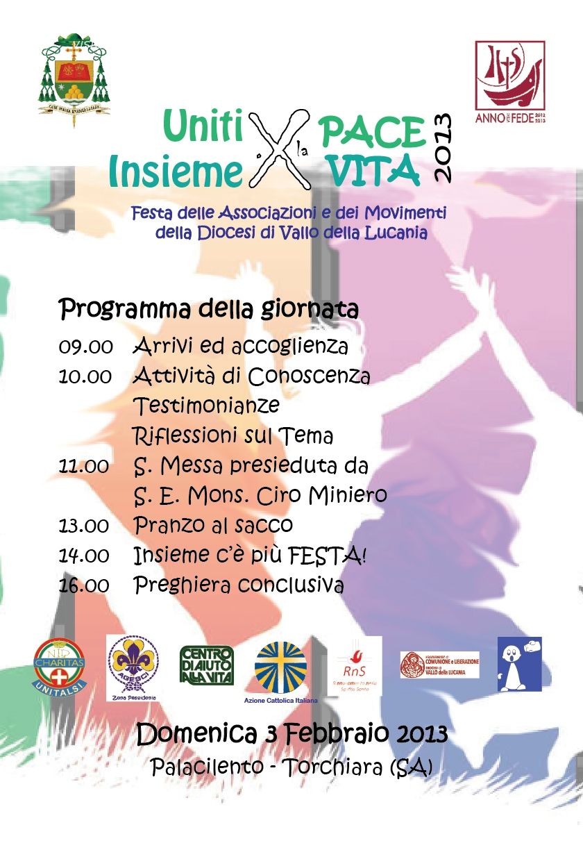 Tema di questa nostra festa sarà "Insieme per la Pace, Uniti per la Vita", uno slogan che indica la modalità del nostro essere cristiani: insieme, per costruire un mondo di pace, uniti perchè la vita possa essere vissuta da tutti in pienezza. Ma è anche un augurio, quello ciòè di poter camminare per lungo tempo insieme, uniti per sempre da legami forti di vera amicizia e comunione, legami che vorremmo iniziare ad allacciare proprio durante la Festa dei Gruppi e dei Movimenti della Diocesi di Vallo della Lucania. Trascorreremo tutta la giornata insieme, cantando, riflettendo, conoscendoci, pregando insieme al nostro Vescovo.