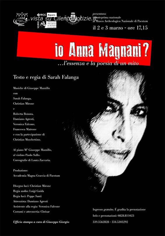 Anche l’Accademia teatrale “Magna Graecia” di Paestum partecipa alle celebrazioni legate al 40° anniversario della scomparsa di Anna Magnani, mettendo in scena presso il Museo Archeologico Nazionale di Paestum, il 2 e il 3 marzo prossimi alle ore 17e15, lo spettacolo dal titolo “Io Anna Magnani?...l'essenza e la poesia di un mito”, ideato e interpretato da Sarah Falanga, nell’ambito della rassegna teatrale “Dal mito a più infinito”.