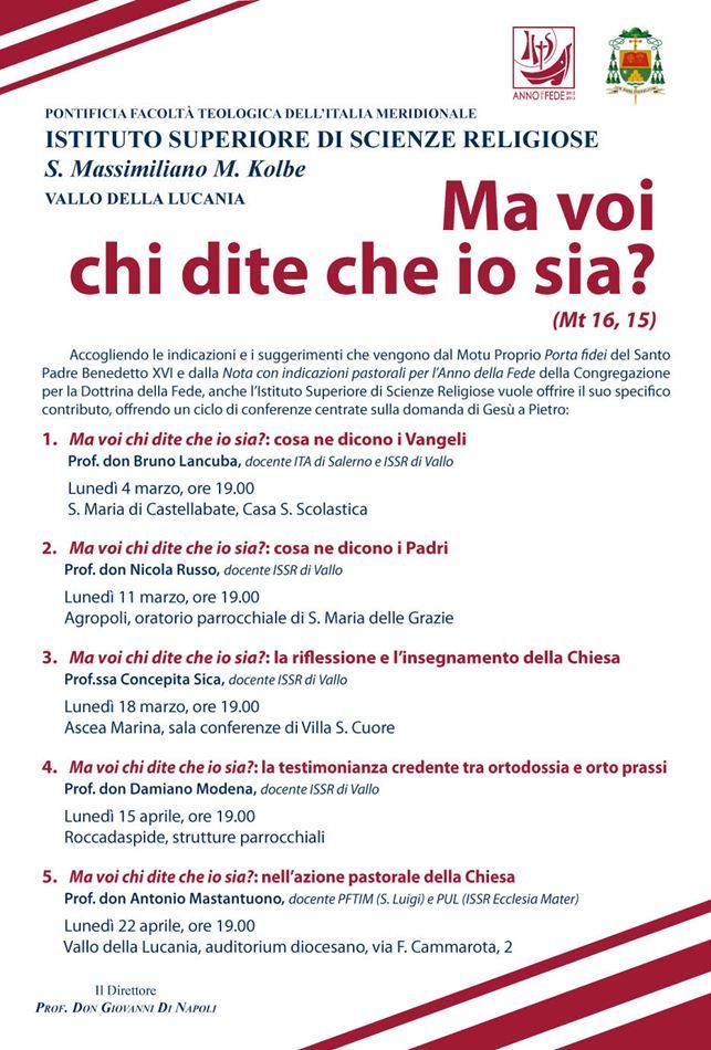 La progettazione delle attività extracurricolari dell’Istituto Superiore di Scienze Religiose di Vallo della Lucania durante l’Anno della Fede, in sintonia con il Motu Proprio Porta Fidei di Benedetto XVI e attenta ai suggerimenti della Nota con indicazioni pastorali per l’Anno della Fede della Congregazione per la Dottrina della fede, offre un ciclo di conferenze incentrato sulla domanda di Gesù a Simon Pietro: Voi chi dite che io sia?