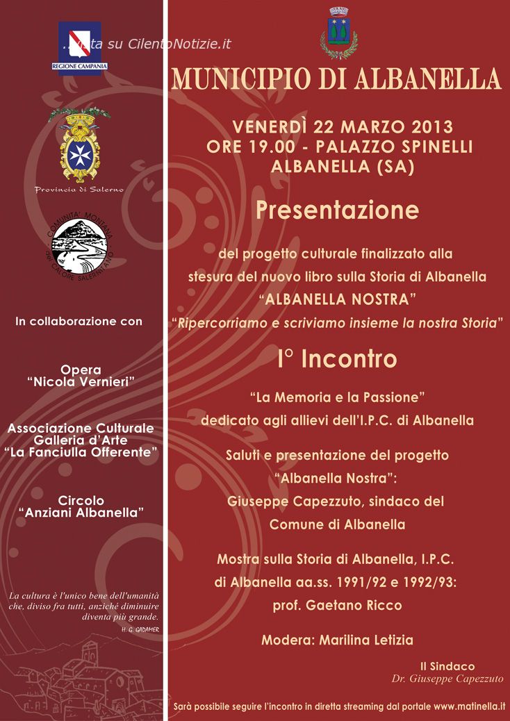 A questo primo dei dieci incontri del progetto Albanella Nostra, riproposto con la collaborazione dell'Opera Nicola Vernieri, la Galleria d'Arte La Fanciulla Offerente, Circolo Anziani di Albanella e tanti giovani locali, relazioneranno il sindaco di Albanella, dr Giuseppe Capezzuto ed il prof. Gaetano Ricco alla presenza di tutti i relatori che prenderanno materialmente parte alla stesura finale del libro.