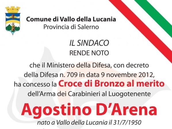 Nel corso di quarantuno anni di carriera militare il luogotenente Agostino D'Arena, nato a Vallo della Lucania il 31/07/1950, ha prestato servizio per l'Arma dei Carabinieri con grande impegno e straordinaria abnegazione. Negli anni 70 ha inseguito i mafiosi con il colonnello Russo, agli ordini del generale Dalla Chiesa ha condotto la battaglia contro le brigate rosse ed é stato, poi, trasferito alla leggendaria Anticrimine milanese del colonnello Bonaventura.