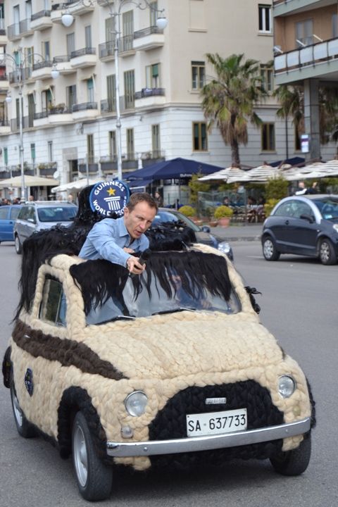 Cristiano Militello, inviato speciale di Striscia la Notizia, ieri a Salerno, per mostrare l’incredibile creazione di Maria Lucia Mugno, parrucchiera di Padula, che ha decorato con capelli veri, provenienti dall’India, una Fiat 500. L’automobile, ricoperta sia all’interno che all’esterno di capelli è già rientrata nel guinnes dei primati nel 2010. [italia2tv.it]