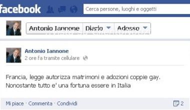 Il presidente della Provincia di Salerno, Antonio Iannone, nella serata di ieri, commenta l’apertura della Francia ai matrimoni gay con questo post: «Francia, legge autorizza matrimoni e adozioni coppie gay. Nonostante tutto è una fortuna essere in Italia». Il post è presente sul profilo facebook ed è visibile a tutti.