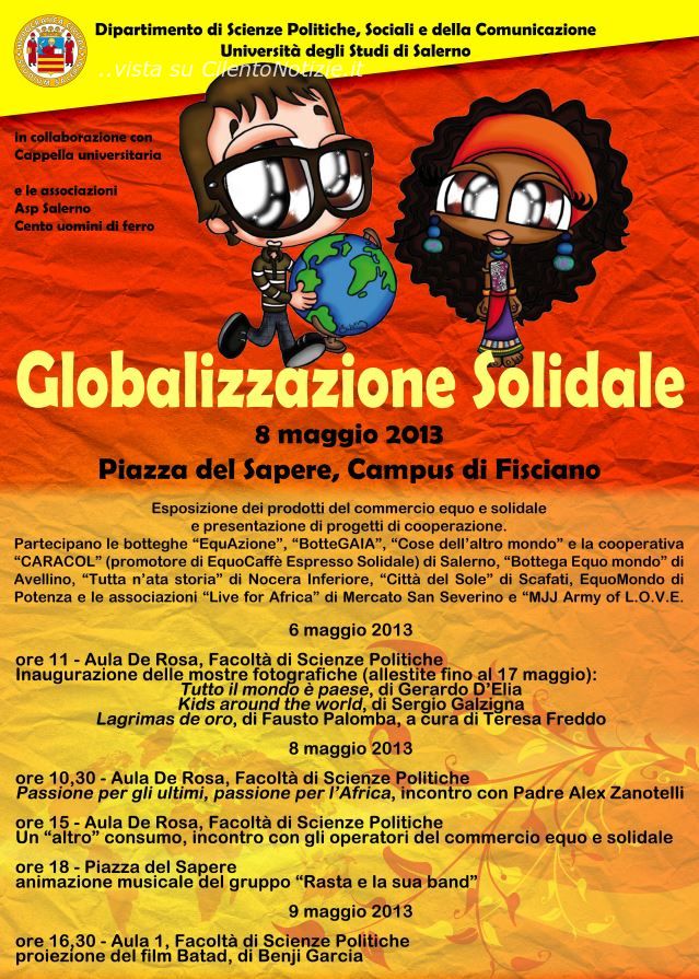 Nata dal desiderio di docenti e studenti del corso di laurea in Scienze Politiche di sperimentare occasioni di incontro con gli operatori del commercio equo e solidale attivi sul territorio, mercoledì 8 maggio p.v. si svolgerà presso il Campus di Fisciano dell’Università degli Studi di Salerno la manifestazione “Globalizzazione solidale”; dalla mattina saranno allestiti in piazza del Sapere i gazebo che ospiteranno le botteghe attive sul territorio ("EquAzione", "BotteGAIA", "Cose dell'altro mondo" e EquoCaffè Espresso Solidale di Salerno, "Bottega Equo Mondo" di Avellino, "Tutta N'ata Storia" di Nocera Inferiore, "Città del Sole" di Scafati, "EquoMondo" di Potenza e le associazione "Live for Africa" di Mercato San Severino e "MJJ Army Of L.O.V.E.").