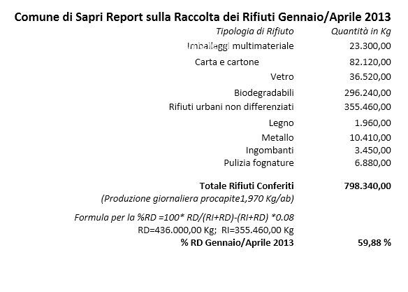 Dopo i primi quattro mesi del 2013 la città di Sapri è vicinissima al 60% di raccolta differenziata, un dato estremamente positivo frutto dell’impegno di tutti ed al grande lavoro degli operatori addetti alla raccolta.
