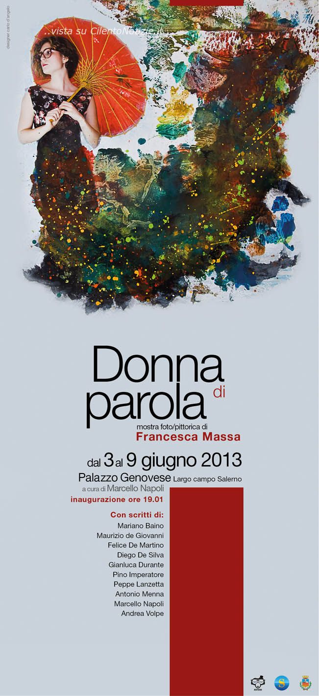 L’appuntamento “Donna di Parola” dal 3 al 9 giugno a Palazzo Genovese, a Largo Campo a Salerno, è di quelli che non si dimenticano facilmente; una fotografa che mostra la sua maturità nel campo tecnico delle immagini e una teoria di scrittori, giornalisti, comunicatori che apostrofano, dialogano con le immagini. Questo è il senso dei dieci scatti di Francesca Massa e dei suoi interventi pittorici che fanno delle pose “parole-specchio” e NON oggetto.