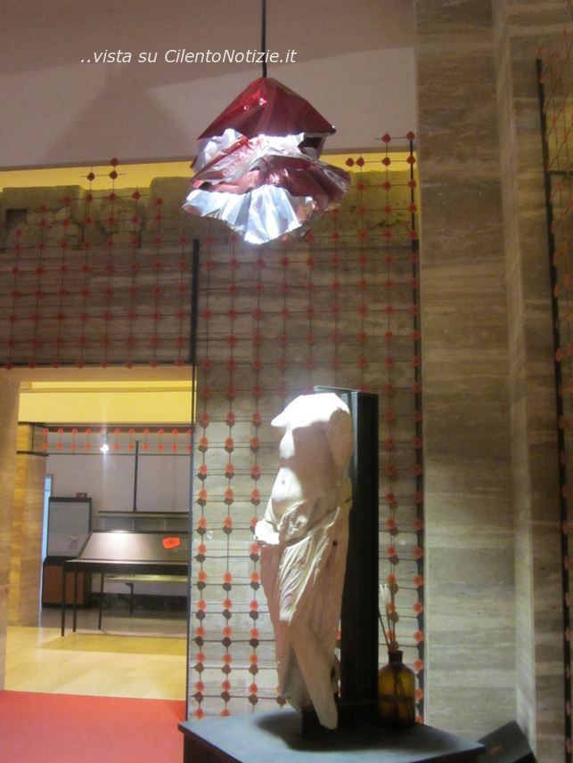 Rose stilizzate introducono nel Museo, dove accoglie profumo di rose adagiate in grandi piatti, nel Salone dominano statue sensuali di Afrodite, Dea anche delle rose. Una scenografia moderna dell’artista Michele Iodice, con pareti di rose e grandi lampadari rossi con vortici di lamine di alluminio che, quali rose dominanti, illuminano il tutto,accompagna in questa simbiosi di presente e passato sul filo di questo famoso fiore adorato nell’antichità a Paestum, elemento importante di traino verso un’elevazione spirituale, ma anche essenziale per realizzazioni di profumi, creme per la bellezza e la salute e per aromatizzare prodotti gastronomici.