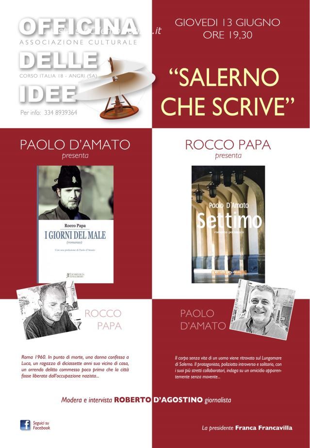 Giovedì 13 giugno alle ore 19,30 in c.so Italia 18 ad Angri, curato dall'associazione culturale "Officina delle Idee" si terrà la serata "Salerno che scrive", dedicata a due scrittori salernitani: Rocco Papa, autore del romanzo "I giorni del male" e Paolo D'Amato, autore del giallo ambientato a Salerno "Settimo". Ogni autore si cimenterà nella presentazione del libro del collega scrittore ed entrambi poi risponderanno alla raffica di domande del giornalista Roberto D'Agostino che modererà la serata.