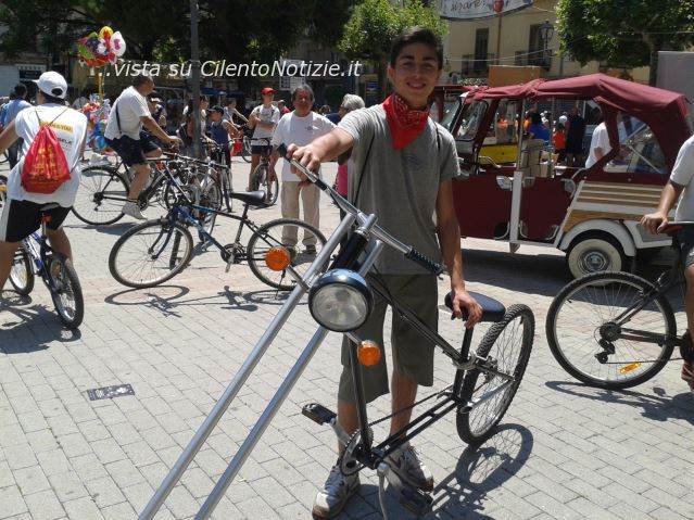 C’è Tullio Villani, soli 18 anni e 7 edizioni consecutive alle spalle, che ha debuttato con la sua bici-custom, costruita da lui stesso utilizzando pezzi avanzati: “È una sorta di chopper pensato ad hoc proprio per la Ciclolonga. Mio padre è titolare di un’autocarrozzeria, per cui sono riuscito a recuperare i pezzi. Ci ho lavorato per circa due mesi, ma la parte più complicata è stata la realizzazione del telaio. La nuova bici ha suscitato grande curiosità. Tutti mi facevano domande, mi salutavano. È stato divertentissimo”.