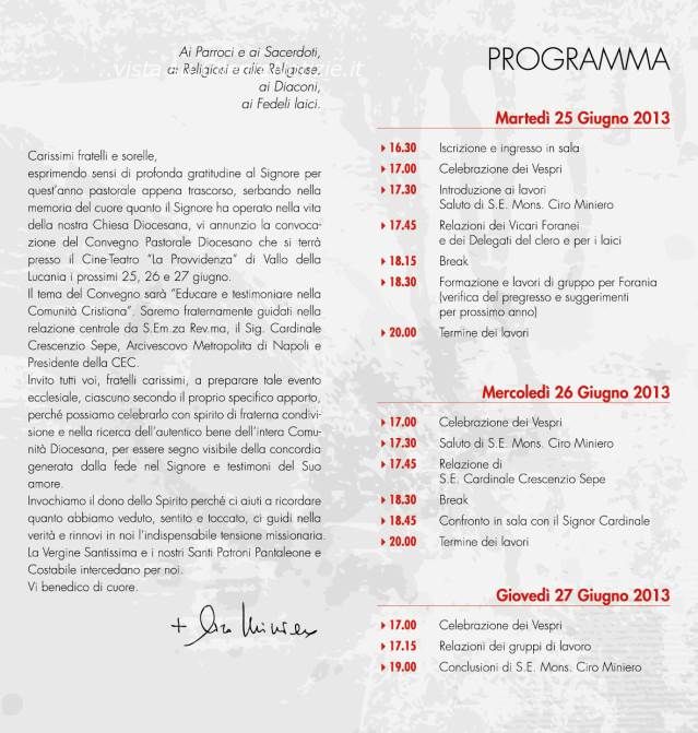 Per la seconda giornata del Convegno Pastorale Diocesano (25-26-27 giugno) presso il teatro La Provvidenza di Vallo della Lucania dalle ore 16.30, tema del convegno "Educare e testimoniare nella Comunità Cristiana", la relazione centrale (mercoledì 26) sarà tenuta da S.Em.za Cardinale Crescenzio Sepe, Arcivescovo Metropolita di Napoli.