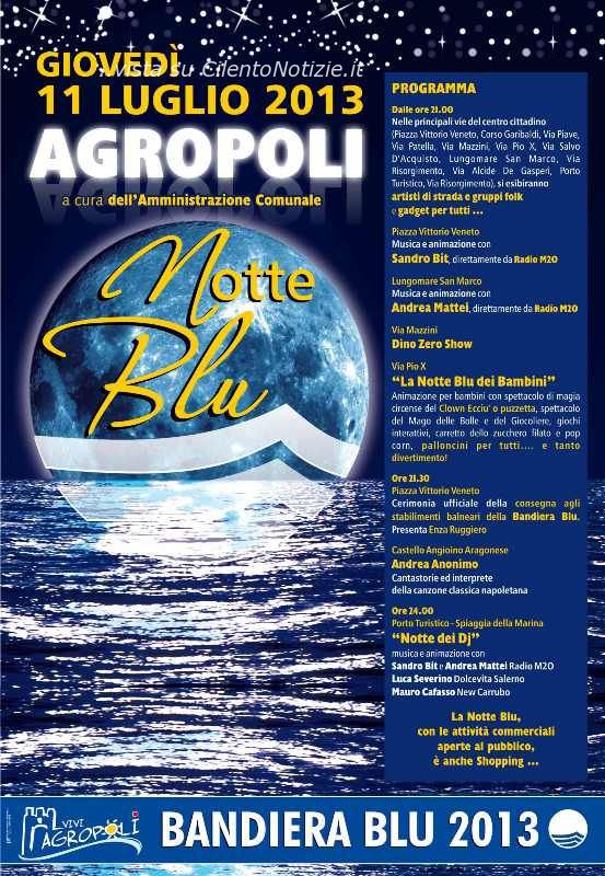 L’evento, in programma giovedì 11 luglio e promosso dall’amministrazione comunale agropolese, prevede una lunga notte di shopping, musica, intrattenimento e animazione per bambini per celebrare l’ottenimento della Bandiera Blu 2013, da quest’anno, per la prima volta, anche per il porto turistico.