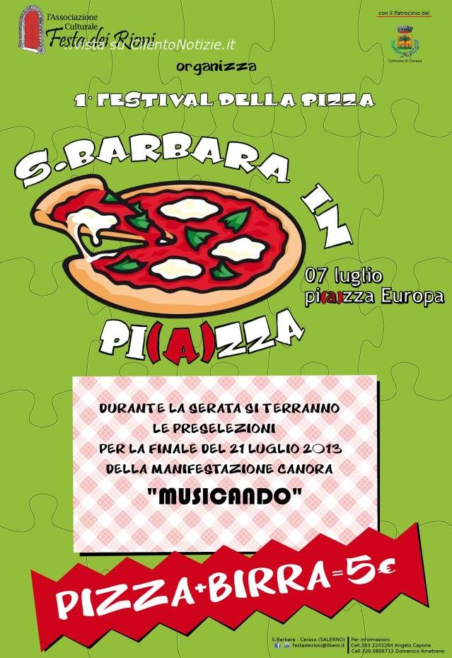 Domani sera 7 Luglio dalle ore 20:00 in S. Barbara, frazione del Comune di Ceraso (SA), l'Associazione Culturale Festa dei Rioni, organizza la I° edizione del "Festival della Pizza" in piazza Europa con l'anteprima della 2° edizione della manifestazione canora "Musicando", che vedrà i partecipanti sfidarsi nella manifestazione canora che si terrà domenica 21 luglio 2013 sempre in piazza Europa della frazione S. Barbara del Comune di Ceraso (SA).
