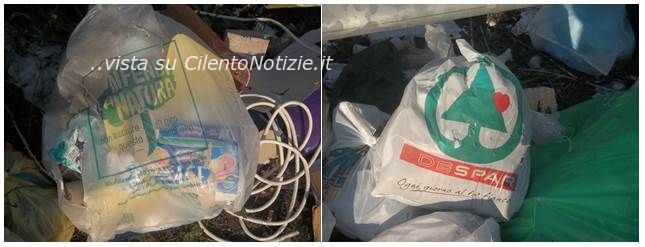 Molti sacchetti parlano chiaro sulla storia della giornata passata al mare, in questo caso del golfo di Policastro dove sventolano bandiere blu e dove si può trovare ancora qualche spiaggia libera o approfittare della formula “prendi tre paghi due”, ovvero un ombrellone, una sdraio e posteggio auto gratis.