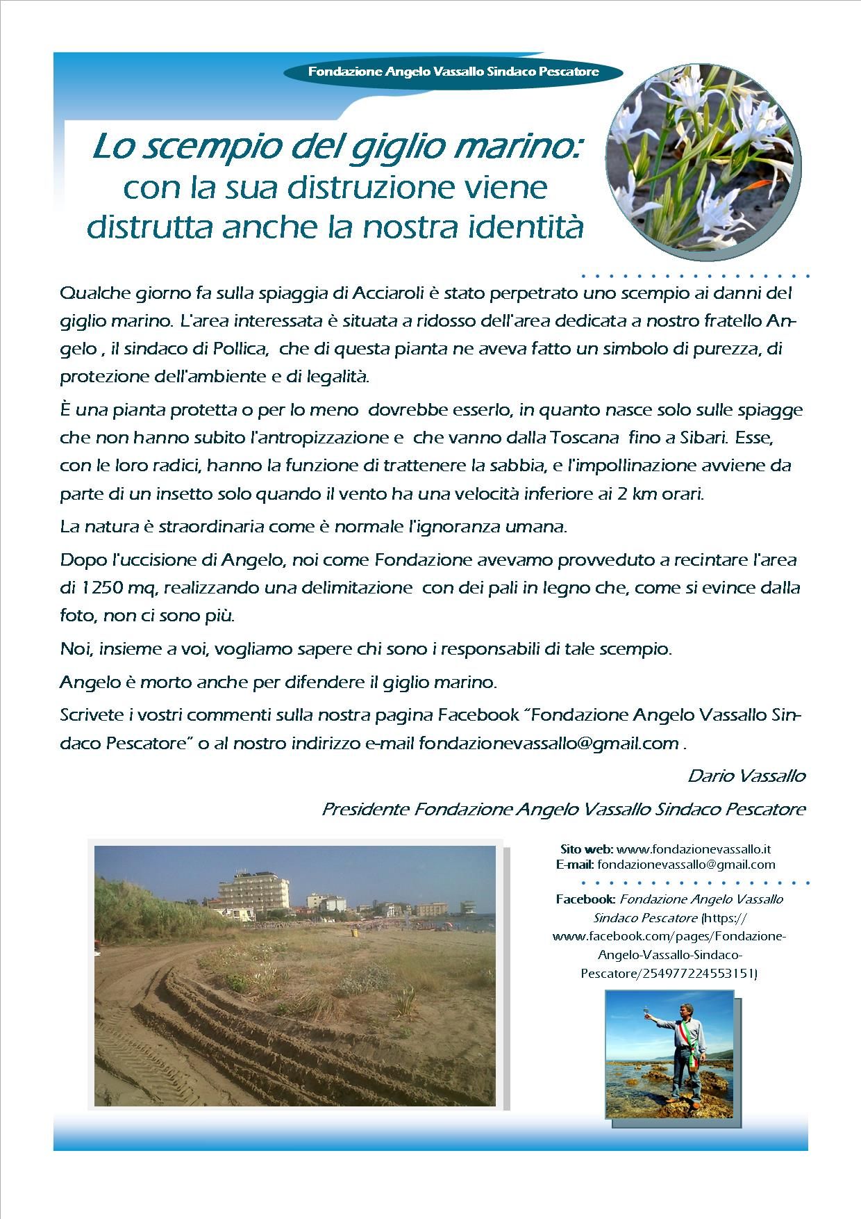 Qualche giorno fa sulla spiaggia di Acciaroli è stato perpetrato uno scempio ai danni del giglio marino. L'area interessata è situata a ridosso dell'area dedicata a nostro fratello Angelo, il sindaco di Pollica, che di questa pianta ne aveva fatto un simbolo di purezza, di protezione dell'ambiente e di legalità.