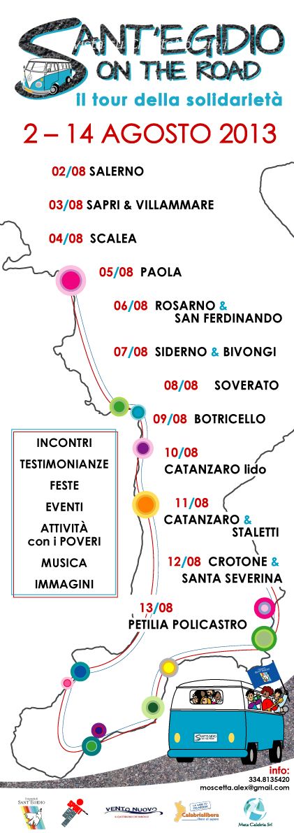 Venerdi 2 agosto partirà il "Sant'Egidio On The Road"! Un itinerario della solidarietà organizzato dai giovani e universitari della Comunità' di Sant'Egidio. Partendo da Roma, l'iniziativa toccherà diverse località del Cilento e della Calabria fino al 14 agosto.