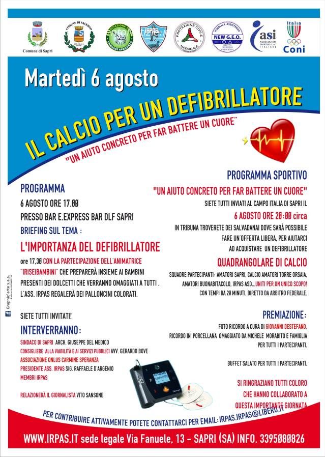 Per una maggiore sensibilizzazione su questo tema, ma soprattutto per raccogliere fondi da destinare all’acquisto di un defibrillatore semi-automatico D.A.E., l’associazione sportiva dilettantistica IRPAS ha organizzato per martedì 6 agosto a Sapri l’evento intitolato “Il calcio per il defibrillatore  - un aiuto concreto per far battere il cuore”, con il patrocinio, oltre che del Comune di Sapri, del Comune di Salerno e dell’ASI (Associazioni sportive e sociali italiane), ente di promozione sportiva riconosciuto dal CONI.