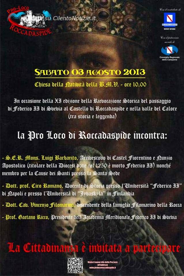 La Pro Loco Roccadaspide, in collaborazione con l’Associazione “Agorà dei liberi” di Capaccio presenta la XI^ edizione della: “Rievocazione storica del passaggio di Federico II al castello di Roccadaspide e nella valle del Calore tra storia e leggenda”