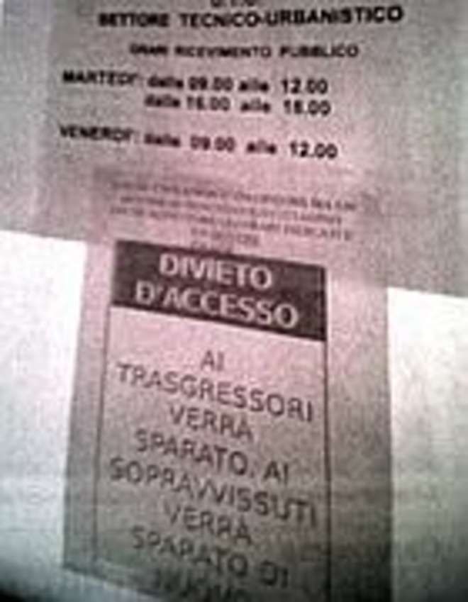 SALERNO - Parole decisamente forti quelle scritte su un volantino del Comune di Vietri sul Mare nel salernitano. Sotto l'orario di ricevimento al pubblico, è stato sistemato un foglio con questa scritta: «Divieto di accesso: ai trasgressori verra sparato. Ai sopravvissuti verrà sparato di nuovo».