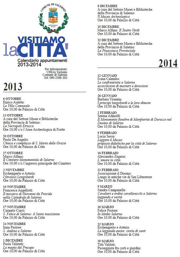 Mercoledì 2 ottobre, presso il Salone del Gonfalone del Palazzo di Città, l’Assessore comunale al Turismo Enzo Maraio ha presentato il calendario 2013-2014 di “Visitiamo la città”, tradizionale ciclo di visite guidate domenicali tra monumenti e percorsi della città di Salerno che prenderà il via domenica 6 ottobre e terminerà domenica 30 marzo 2014.