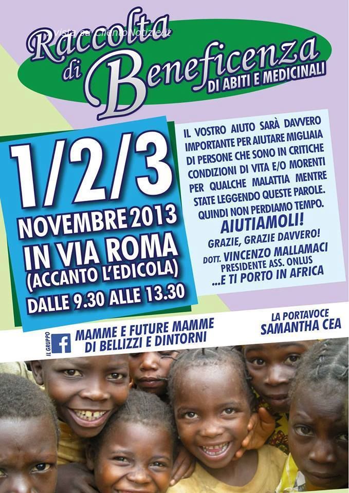 Nei giorni 1, 2 e 3 Novembre dalle 9.30 alle 13.30 in Via Roma a Bellizzi, accanto l’edicola e la chiesa si terrà un banchetto informativo e di beneficenza per i bambini africani. Ci sarà una raccolta di tutto ciò che non viene utilizzato, abiti estivi per bambini ed adulti, farmaci e quanto si voglia donare ancora, in più ci sarà la vendita di piantine, del costo di 5 euro cadauna, per sovvenzionare la costruzione di alcuni edifici in Costa d’Avorio, in primis l’orfanotrofio. “Fare beneficenza per chi è meno fortunato di te... ti guarisce l'anima” – è quanto scrive sul social network facebook la portavoce dell’evento Samantha Cea, che continua – “Siamo orgogliosi di prestare aiuto a queste popolazioni meno fortunate di noi ed in questi 3 giorni faremo del nostro meglio per coinvolgere le persone del territorio e illustrare loro quali sono le reali problematiche che vivono migliaia di persone”. “Ringrazio in anticipo le mamme di Bellizzi e i cittadini tutti che parteciperanno a questa iniziativa, l’amministrazione comunale per averci dato l’opportunità di poter mostrare ai bellizzesi una realtà che purtroppo non tutti conoscono e radio MPA, nella figura di Andrea Volpe, per l’intervista che farà al presidente dell’associazione ONLUS …E ti porto in Africa, Vincenzo Mallamaci”. L’associazione “Siamo vicini con il nostro affetto a quanti vorranno contribuire all’apertura dell’Orfanotrofio Oasi San Francesco d’Assisi in Costa d’Avorio, - dichiara Mallamaci - affinche’ 350 bambini orfani possano avere la loro casa. Anche Tu puoi far si che presto l’Orfanotrofio apra le sue porte all’Amore”. “Il Vostro AIUTO – conclude - sarà davvero importante per aiutare migliaia di persone che sono in critiche condizioni di vita e/o morenti per qualche malattia mentre state leggendo queste parole. Quindi non perdiamo tempo. Aiutiamoli! Grazie, Grazie Davvero!”. Per contattare l'Associazione, per conoscere ogni informazione puoi farlo scrivendoci a: vmalla@virgilio.it - oppure puoi scrivere alla casella postale: Associazione Onlus E ti porto in Africa, Viale della Repubblica 3, 84047 Capaccio Scalo (Salerno) ITALIA, Per contatti telefonici chiama al 3347413875 / 3398937734, per altre informazioni visita il sito www.etiportoinafrica.altervista.org