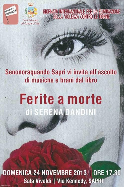 In occasione della "Giornata internazionale per la eliminazione della violenza contro le donne" fissata dall'ONU per il giorno del 25 novembre di ciascun anno, il Comitato di SENONORAQUANDO  di Sapri invita le cittadine ed i cittadini di Sapri a  partecipare alla lettura di alcune delle lettere tratte dal libro "Ferite a morte" di Serena Dandini. Insieme alle donne del movimento saranno protagonisti/e delle letture anche giovani alunni/e delle scuole secondarie superiori. Noi siamo convinte che la grave situazione di violenza possa essere sconfitta solo con la consapevolezza di tutti/e e con un cambiamento di rapporto tra le persone che ponga in primo piano l'eliminazione di ogni discriminazione e stereotipo di genere ed il  recupero del valore del   rispetto per l'altro/a e per le sue diversità.
