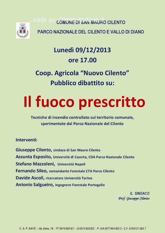 LunedĂŹ 9 dicembre alle ore 17.00 a San Mauro Cilento, presso la sede della Coop. Agricola Nuovo Cilento, si terrĂ un pubblico dibattito sul tema "IL FUOCO PRESCRITTO - Tecniche di incendio controllato sul territorio comunale, sperimentate dal Parco Nazionale del Cilento".