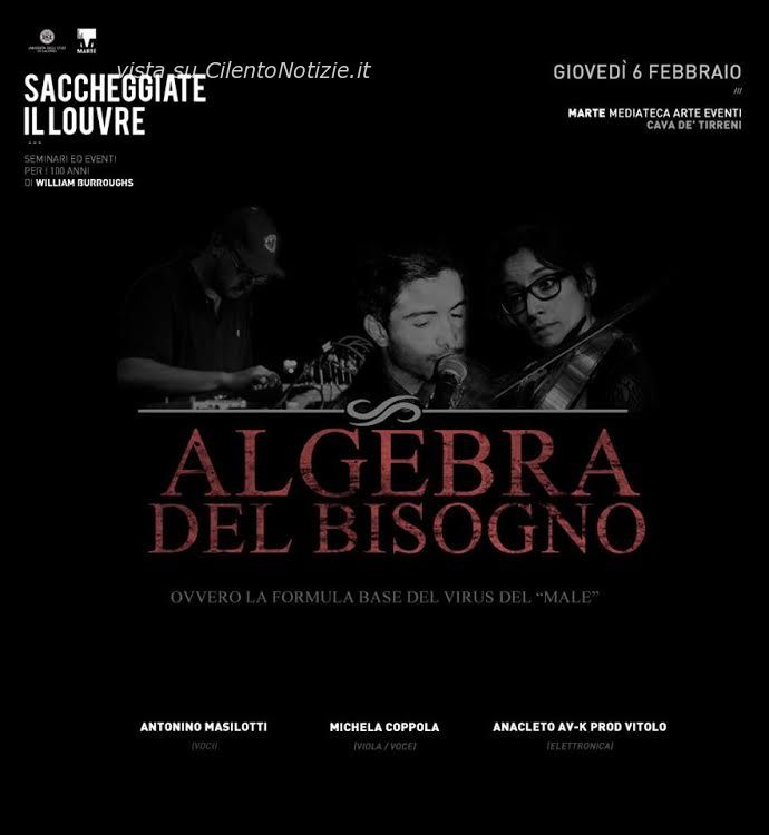 Alla parte seminariale seguiranno tre sezioni per ''Saccheggiate il Louvre – II act'', giovedì 6 presso la Mediateca MARTE a Cava de' Tirreni (SA). Alle ore 19.30, è previsto il vernissage della mostra ''Ikon. Per una fisiognomica burroughsiana'' (aperta fino al 12 febbraio) con opere degli artisti Chiara Caterina, Valentina Cipullo, Davide Cocozza, Emanuela D'Ambrosi, Giovanni De Michele, Alfredo De Sia, Fausto Fiato, Giovanni Loria, Daniela Yukiko Magliulo, Tommaso Mariniello, Vittoria Piscitelli, Trama 70, Andrea Troisi, Vincenzo Trapanese, con una nota critica di Marcello Francolini. Lo stesso giorno, alle 20.30, inizierà la performance ''Il passo successivo. Per una geografia burroughsiana dei corpi” con gli artisti Giovanna D'Amico (“Trip of the Senses #II”), Piero Leccese (''And the Hippos Were Boiled in Their Tanks'') e Costabile Guariglia (''Junkie 1/18''). Infine, alle 22.30, Michela Coppola (viola e voce), Antonino Masiliotti (voci) e Anacleto AV-k Prod. Vitolo (elettronica) saranno i protagonisti del concerto-reading ''Algebra del bisogno. Ovvero la formula base del virus del male''.