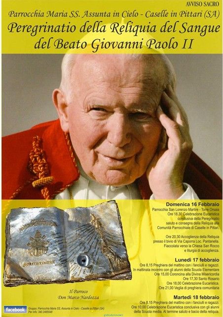 Arriva la Sacra Reliquia del sangue di Giovanni Paolo II nel Cilento. Fino al 17 febbraio il reliquiario che contiene l’ampolla con il sangue prelevato dal Beato nel giorno della sua morte, sarà accolto nelle parrocchie e negli ospedali del Cilento e Vallo di Diano. Grande fermento, così, presso i principali centri della Diocesi di Teggiano Policastro, in occasione della ventiduesima Giornata Mondiale del Malato. Di seguito il programma completo della Parrocchia Maria SS Assunta in Cielo – Caselle in Pittari:
