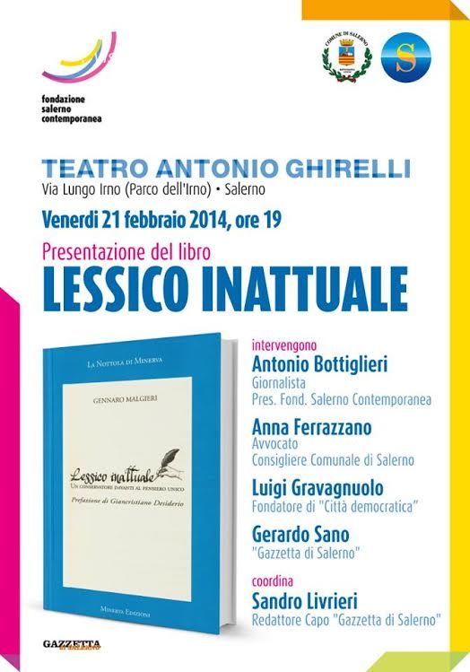 La Fondazione Salerno Contemporanea presenta “Lessico inattuale”, il nuovo libro di Gennaro Malgieri: giornalista, scrittore, già direttore del Secolo. L’appuntamento è venerdì 21 febbraio, alle ore 19, al Teatro Antonio Ghirelli di Salerno. Il saggio, che rappresenta un piccolo dizionario “antimoderno”, scandaglia la crisi del nostro tempo riferendosi all'uso distorto delle parole usate più di frequente. È un testo scopertamente polemico nei confronti del cosiddetto “politicamente corretto”. Austerità, Crisi, Depressione, Indignazione, Gossip, Pandemia, Partiti: sono solo alcune delle parole che Gennaro Malgieri analizza all'interno di questo dizionario sociale e ideale. Parole che esprimono idee, ma quando queste s'impoveriscono anche le prime assumono connotazioni anomale, con conseguenze negative per la comprensione dei fenomeni sociali, culturali e politici del mondo contemporaneo.
