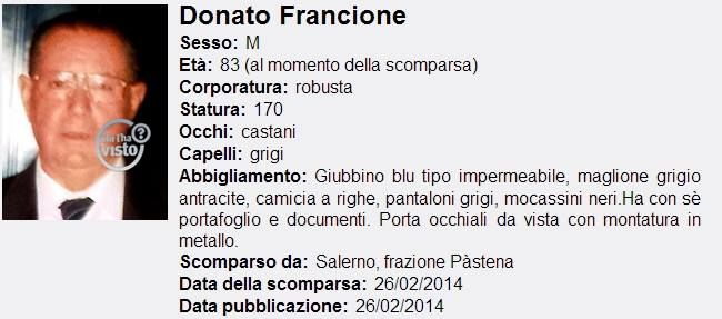 E’ scomparso ieri da Salerno, in località Pastena, Donato Francione, 83enne originario di Roccadaspide. L’uomo, di corporatura robusta, è alto 1metro e 70 centimetri, ha gli occhi castani e i capelli grigi. Al momento della scomparsa indossava un impermeabile blu, un maglione grigio antracite, camicia a righe, pantaloni grigi e mocassini neri. Ha con sé portafoglio e documenti. Porta occhiali da vista con montatura in metallo nera. La notizia della scomparsa è stata annunciata anche dalla trasmissione di Rai3 “Chi l’ha visto?”.