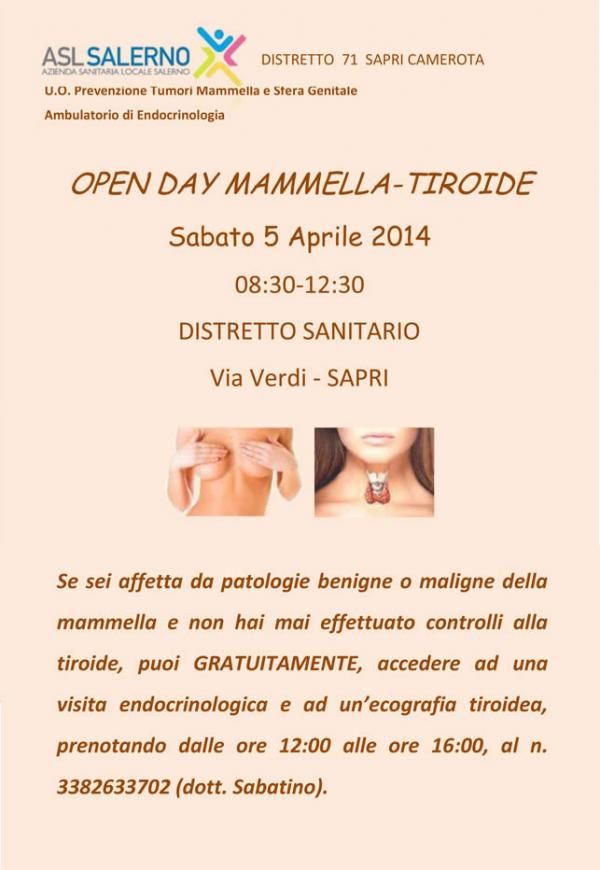 Presso il Distretto Sanitario di Sapri Sabato 5 aprile dalle ore 8.30 alle 12.30 saranno effettuate GRATUITAMENTE e solo su PRENOTAZIONE, ecografie tiroidee a donne con patologia benigna o maligna della mammella che non abbiano mai fatto controlli tiroidei.