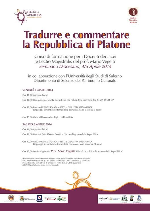 di Giovanni Mautone | BlogL’Agone Parmenideo e il Certamen Velinum, che si svolgeranno a Vallo della Lucania dal 4 al 5 Aprile prossimi, non si limiteranno a favorire solo lo studio degli alunni che parteciperanno alle competizioni. L’associazione Achille e la Tartaruga, promotrice dei concorsi scolastici ideati dalla Vicepresidente Maria Rosaria Trama, ha infatti deciso di approfittare dell’occasione per promuovere anche la formazione dei docenti che accompagneranno i loro alunni con un corso di formazione gratuito previsto per le stesse giornate. In collaborazione con l’Università di Salerno e del Dipartimento di Scienze del Patrimonio Culturale infatti si terrà il corso di formazione “Tradurre e commentare la Repubblica di Platone”, con una serie di lezioni organizzate secondo il seguente calendario: