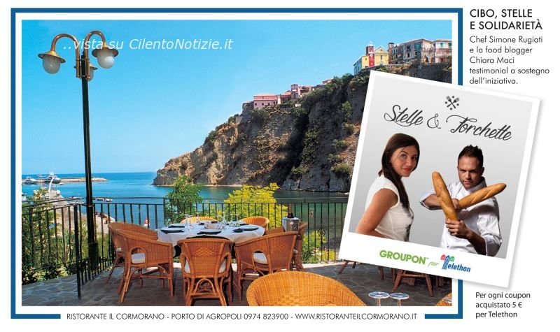 Cibo, stelle e solidarietà. Ecco da dove ha origine il nuovo progetto "Stelle & Forchette" di Groupon che unisce l'eccellenza dei migliori ristoranti stellati e forchettati d'Italia con le stelle della Fondazione Telethon, da oltre 20 anni in prima linea nella ricerca sulle malattie genetiche. Testimonial della campagna lo Chef Simone Rugiati e la food blogger Chiara Maci, volti noti del mondo food in TV e sul web, che sostengono attivamente l'iniziativa. Durante la settimana di "Stelle & Forchette", dal 5 all'11 maggio, ogni cliente Groupon potrà acquistare prestigiosi menu di coppia in uno dei 64 ristoranti, di tutta Italia, che hanno aderito all'iniziativa. Nel Cilento è stato selezionato, Il Cormorano, l’esclusivo ristorante di pesce, due forchette Michelin e cravattino d'oro Amira, situato all’interno di un palazzo cinquecentesco, nel Porto di Agropoli vicino al Museo Civico delle Arti, che con la caratteristica terrazza sul mare affacciata sul porto e sull’incantevole paesaggio circostante e la saletta in pietra viva, conquista anche i clienti più esigenti. In cucina, da sapienti mani, vengono preparate numerose specialità di pesce e piatti legati all’antica tradizione cilentana con prodotti a km 0 e biologici. In sala, personale professionale e qualificato accoglie i clienti e mostra il pescato del giorno suggerendo le scelte ed assecondando i desideri della clientela accompagnato il tutto con ottimi vini del territorio. Non sarà difficile incontrare anche numerosi vip, italiani e stranieri, che trascorrono qualche ora all’insegna del gusto. Per l’iniziativa il Cormorano offrirà ai propri clienti tre menù degustazione e per ogni coupon acquistato saranno devoluti 5€ a Telethon per sostenere la cura e la ricerca sulle malattie genetiche. Sono circa 16.000 le cene solidali firmate Michelin e Gambero Rosso in tutta Italia e che è possibile acquistare al seguente indirizzo http://stelleforchette.groupon.it/, da 59€ a 179€ per un menu di coppia, e prenotare fino ad agosto 2014. L'obiettivo è raccogliere 80.000€ da devolvere a Telethon.